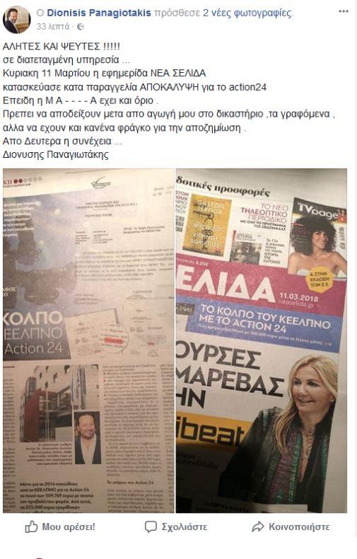 «ΑΛΗΤΕΣ ΚΑΙ ΨΕΥΤΕΣ !!!!! σε διατεταγμένη υπηρεσία … Κυριακή 11 Μαρτίου η εφημερίδα ΝΕΑ ΣΕΛΙΔΑ κατασκεύασε κατά παραγγελία ΑΠΟΚΑΛΥΨΗ για το action24. Επειδή η Μ Α – – – – Α έχει και όριο. Πρέπει να αποδείξουν μετά από αγωγή μου στο δικαστήριο ,τα γραφόμενα , αλλά να έχουν και κανένα φράγκο για την αποζημίωση. Από Δευτέρα η συνέχεια … Διονύσης Παναγιωτάκης», ανέφερε στην ανάρτησή του.