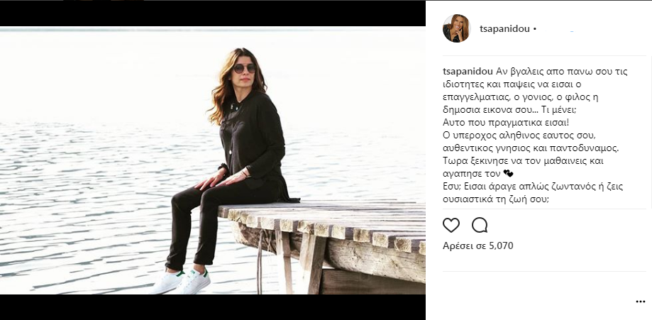 Συγκεκριμένα, η Πόπη Τσαπανίδου έγραψε: «Αν βγάλεις από πάνω σου τις ιδιότητες και πάψεις να είσαι ο επαγγελματίας, ο γονιός, ο φίλος η δημόσια εικόνα σου… Τι μένει; Αυτό που πραγματικά είσαι! Ο υπέροχος αληθινός εαυτός σου, αυθεντικός γνήσιος και παντοδύναμος. Τώρα ξεκίνησε να τον μαθαίνεις και αγάπησέ τον. Εσύ; Είσαι άραγε απλώς ζωντανός ή ζεις ουσιαστικά τη ζωή σου;».