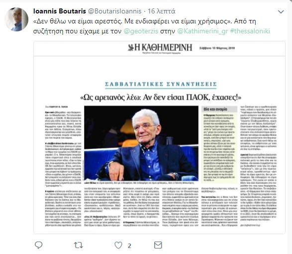 Στον απόηχο της συνέντευξης του, ο κ. Μπουτάρης σχολίασε τα όσα είπε με ανάρτησή του στο Twitter γράφοντας: «Δεν θέλω να είμαι αρεστός. Με ενδιαφέρει να είμαι χρήσιμος». Από τη συζήτηση που είχαμε με τον @geoterzis στην @Kathimerini_gr #thessaloniki.
