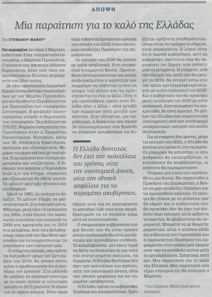 Σε άρθρο του που φιλοξενεί σήμερα η «Καθημερινή της Κυριακής», ο πρώην υπουργός, Στέφανος Μάνος καλεί τον Πρόεδρο της Δημοκρατίας, Προκόπη Παυλόπουλο, εξηγώντας πως οι επόμενες εκλογές που πρέπει να γίνουν μέχρι τον Σεπτέμβριο του 2019 θα διεξαχθούν με το υφιστάμενο εκλογικό σύστημα που δίνει 50 έδρες μπόνους και θα γίνουν όποτε ο πρωθυπουργός κρίνει ότι οι συνθήκες τον ευνοούν.