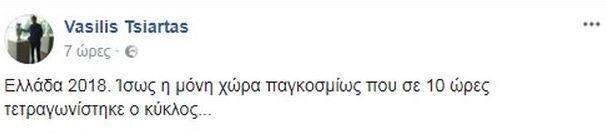 Ο παλαίμαχος διεθνής ποδοσφαιριστής της ΑΕΚ -που κατά καιρούς έχει προκαλέσει αντιδράσεις με τις ρατσιστικές αναρτήσεις του στα μέσα κοινωνικής δικτύωσης- έγραψε στο Facebook: «Ελλάδα 2018. Ίσως η μόνη χώρα παγκοσμίως που σε 10 ώρες τετραγωνίστηκε ο κύκλος…».