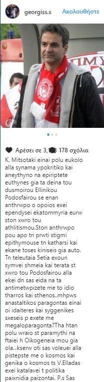 «Κ. Μητσοτάκη είναι πολύ εύκολο, αλλά συνάμα υποκριτικό κι ανεύθυνο να επιρρίπτετε ευθύνες για τα δεινά του δύσμοιρου ελληνικού ποδοσφαίρου σε έναν άνθρωπο, ο οποίος έχει επενδύσει εκατομμύρια ευρώ στον χώρο του αθλητισμού. Στον άνθρωπο που από την πρώτη στιγμή επιθυμούσε την κάθαρση και έκανε τόσες κινήσεις για αυτό.