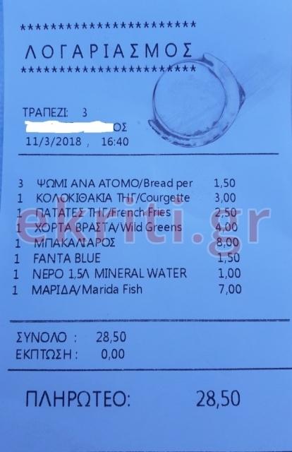 Είναι ο “λογαριασμός” μιας οικογένειας από το Ηράκλειο, που πήγε να φάει σε ταβέρνα την Κυριακή.