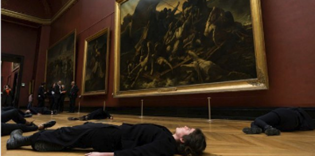 Στην αίθουσα όπου εκτίθεται ο πίνακας του Ζερικό «Η Σχεδία της Μέδουσας» – για να ακριβολογούμε η ονομασία του πίνακα στα ελληνικά οφείλει να είναι «Η Σχεδία του “Μέδουσα”» καθώς πρόκειται για ονομασία καραβιού, αλλά έτσι έχει επικρατήσει – μια ομάδα ανθρώπων σωριάστηκαν στο πάτωμα ακριβώς μπροστά από τον πίνακα, επεκτείνοντας μέσα στην αίθουσα τη σκηνή του ναυαγίου. Ήταν οι ακτιβιστές «Libérons le Louvre (Ας απελευθερώσουμε το Λούβρο)», κάποιοι στο πάτωμα, κάποιοι άλλοι όρθιοι να απαριθμούν τα «κατορθώματα» του κολοσσού πετρελαίου και φυσικού αερίου Total, ενός από τους χορηγούς του μουσείου.