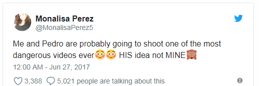 «Ο Πέδρο κι εγώ θα καταγράψουμε πιθανόν ένα από τα πιο επικίνδυνα βίντεο που έχουν γυριστεί ποτέ», είχε γράψει η νεαρή την ημέρα του δράματος στον λογαριασμό της στο Twitter. «ΔΙΚΗ ΤΟΥ ιδέα, όχι ΔΙΚΗ ΜΟΥ».