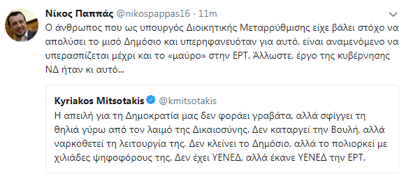 Αφορμή για το σχόλιο του κ. Παππά ήταν το απόσπασμα της ομιλίας του κ. Μητσοτάκη, στο οποίο ο πρόεδρος της ΝΔ σημείωσε ότι «η απειλή για τη Δημοκρατία μας δεν φοράει γραβάτα, αλλά σφίγγει τη θηλιά γύρω από τον λαιμό της Δικαιοσύνης. Δεν καταργεί την Βουλή, αλλά ναρκοθετεί τη λειτουργία της. Δεν κλείνει το Δημόσιο, αλλά το πολιορκεί με χιλιάδες ψηφοφόρους της. Δεν έχει ΥΕΝΕΔ, αλλά έκανε ΥΕΝΕΔ την ΕΡΤ».