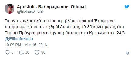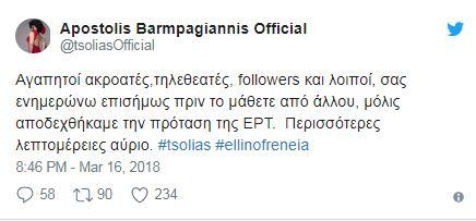 Ο Αποστόλης Μπαρμπαγιάννης, ο γνωστός τσολιάς της εκπομπής, στον προσωπικό του λογαριασμό στο Twitter, ανέβασε ένα μήνυμα που ενθουσίασε τους φανατικούς της εκπομπής «Ελληνοφρένειας».