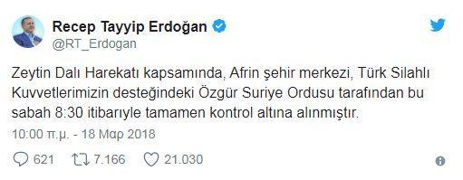 «Το κέντρο της πόλης Αφρίν είναι υπό τον απόλυτο έλεγχο του ελεύθερου συριακού στρατού με την υποστήριξη των τουρκικών ενόπλων δυνάμεων, από τις 8:30 το πρωί», ανακοίνωσε ο Ταγίπ Ερντογάν σε ομιλία του.
