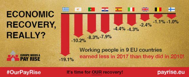 H ΓΣΕΕ κοινοποίησε ανακοίνωση της Συνομοσπονδίας Ευρωπαϊκών Συνδικάτων (ETUC), που μεταξύ άλλων αναφέρει ότι «οι εργαζόμενοι σε 9 χώρες της Ευρωπαϊκής Ένωσης κέρδισαν λιγότερα το 2017 από το 2010. Οι 9 χώρες είναι οι εξής: Ιταλία, Ηνωμένο Βασίλειο, Ισπανία, Βέλγιο, Ελλάδα, Πορτογαλία, Φινλανδία, Κροατία και Κύπρος. Επιπλέον, οι εργαζόμενοι σε 6 από τις παραπάνω χώρες – Ιταλία, Ηνωμένο Βασίλειο, Ισπανία, Βέλγιο, Ελλάδα και Φινλανδία – κέρδισαν λιγότερα το 2017 από το 2016.