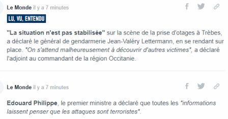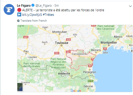 "Everything leads us to believe it is a terror attack" – French President Emmanuel Macron on ongoing #Trèbes hostage situation https://t.co/cABeHf80xK pic.twitter.com/Ez29rtrSIl