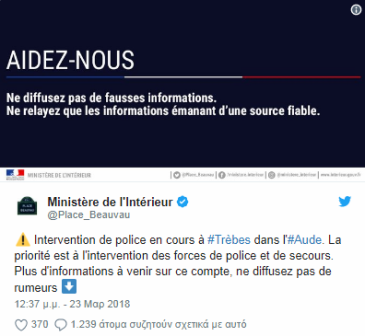 Υπενθυμίζεται ότι νωρίτερα ένας άνδρας εισέβαλε οπλισμένος στο σουπερμάρκετ και αμέσως μετά ακούστηκαν πυροβολισμοί. Σύμφωνα με την αστυνομία οκτώ άτομα κρατούνταν όμηροι, ενώ ο δήμαρχος της Τρεμπ δήλωσε στο τηλεοπτικό δίκτυο BFM ότι υπάρχουν δύο νεκροί.