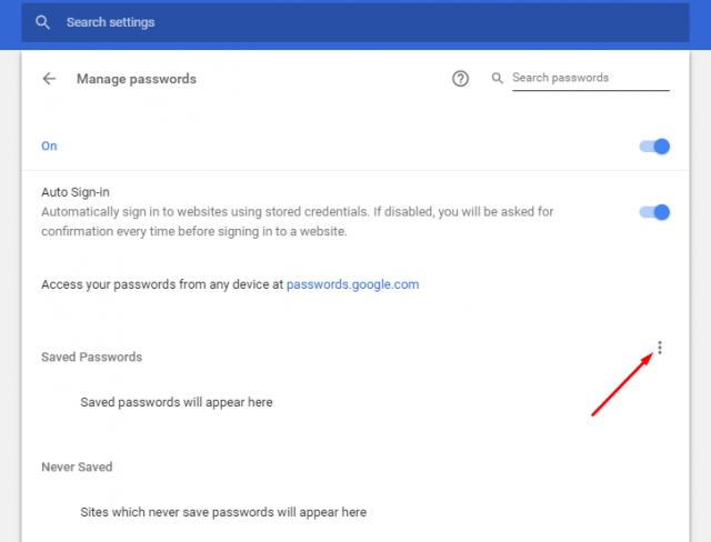 Από τη στιγμή που τρέχεις κάποια Chrome Dev Channel build μπορείς να μεταβείς στο Settings > Manage Password > Export. Τώρα πίεσε στο Export Passwords.
