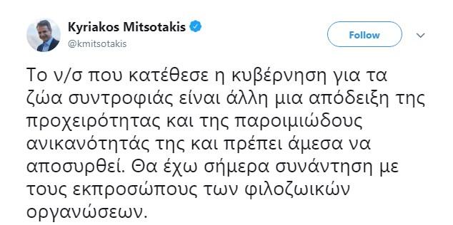 «Το ν/σ που κατέθεσε η κυβέρνηση για τα ζώα συντροφιάς είναι άλλη μια απόδειξη της προχειρότητας και της παροιμιώδους ανικανότητάς της και πρέπει άμεσα να αποσυρθεί. Θα έχω σήμερα συνάντηση με τους εκπροσώπους των φιλοζωικών οργανώσεων», γράφει ο κ Μητσοτάκης