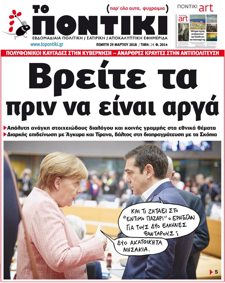 Με πρωτοσέλιδο τίτλο «Βρείτε τα πριν να είναι αργά» και αναλυτικό-αποκαλυπτικό ρεπορτάζ για την ανάγκη στοιχειώδους διαλόγου και κοινής γραμμής στα εθνικά θέματα.