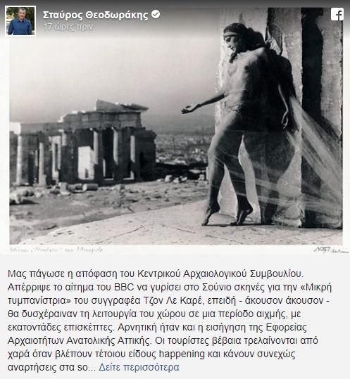 Το ζήτημα που προέκυψε από την άρνηση του ΚΑΣ χορηγήσει στο BBC άδεια για γύρισμα στον αρχαιολογικό χώρο του Σουνίου, σχολίασε μέσω Facebook ο επικεφαλής του Ποταμιού Σταύρος Θεοδωράκης.