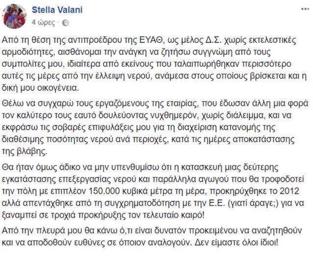 Συγγνώμη από τους συμπολίτες της, «ιδιαίτερα από εκείνους που ταλαιπωρήθηκαν περισσότερο αυτές τις μέρες από την έλλειψη νερού», ζήτησε μέσω Facebook, η αντιπρόεδρος της ΕΥΑΘ και στέλεχος των Ανεξαρτήτων Ελλήνων, Στέλλα Βαλάνη.