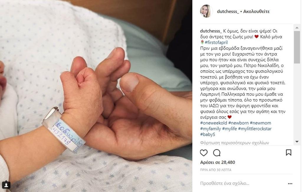 Πριν μια εβδομάδα ξαναγεννήθηκα μαζί με τον γιο μου! Ευχαριστώ τον άντρα μου που ήταν και είναι συνεχώς δίπλα μου, τον γιατρό μου, Πέτρο Νικολαΐδη, ο οποίος ως υπέρμαχος του φυσιολογικού τοκετού, με βοήθησε να έχω έναν υπέροχο, φυσιολογικό και φυσικό τοκετό, γρήγορα και ανώδυνα, την μαία μου Λαμπρινή Παλληκαρά που μου έμαθε να μην φοβάμαι τίποτα, όλο το προσωπικό του ΙΑΣΩ για την άψογη φροντίδα και φυσικά όλους εσάς για την αγάπη και την ενέργεια σας»