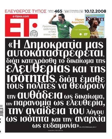 Για να είμαστε ακόμα πιο δίκαιοι και να μην απαρνιόμαστε και τα δικά μας δημοσιογραφικά λάθη, στις ταραγμένες μέρες του Δεκέμβρη του 2008 το ρητό του Ισοκράτη είχε κοσμήσει το πρωτοσέλιδο του Ελεύθερου Τύπου. Η εφημερίδα κυκλοφόρησε έχοντας στην πρώτη σελίδα της με τεράστια γράμματα σε κατάμαυρο φόντο το δήθεν ρητό του Ισοκράτη: