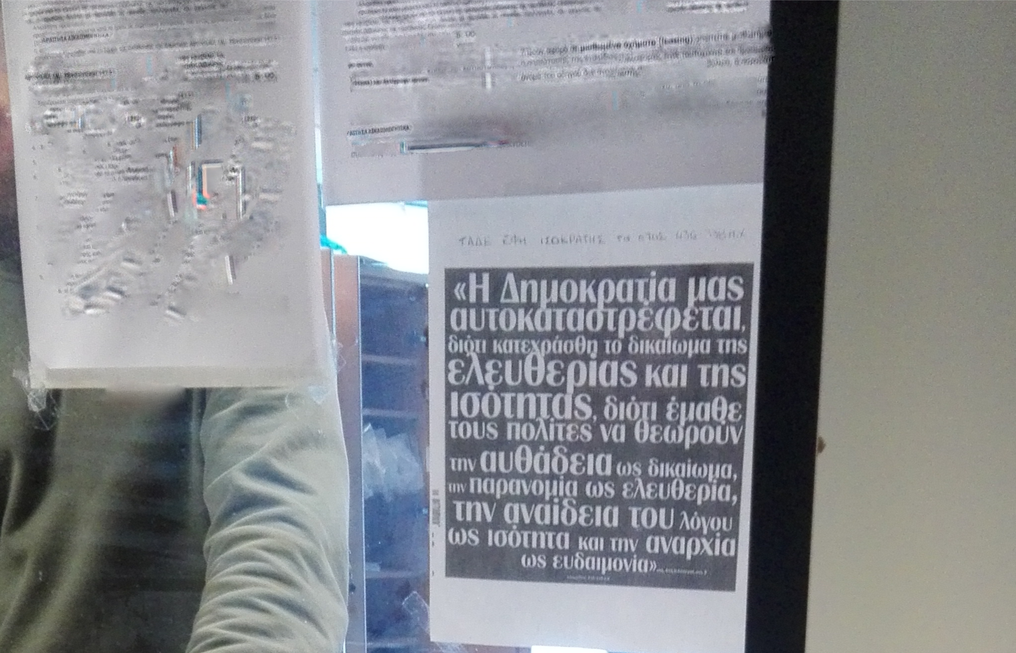 Το ψεύτικο ρητό του Ισοκράτη για την «αυτοκαταστροφή της δημοκρατίας» κοσμεί γκισέ δημοτικής υπηρεσίας του Δήμου Αθηναίων. Είναι εντυπωσιακό πως έχει επιτραπεί να τοιχοκολληθεί σε περίοπτη θέση μία τέτοια εικόνα. Το «ρητό του Ισοκράτη» έχει φιλοξενηθεί πολλές φορές σε ακροδεξιά site και σελίδες και μιλά για την δημοκρατία αλλά και το πως καταστρατηγείται.