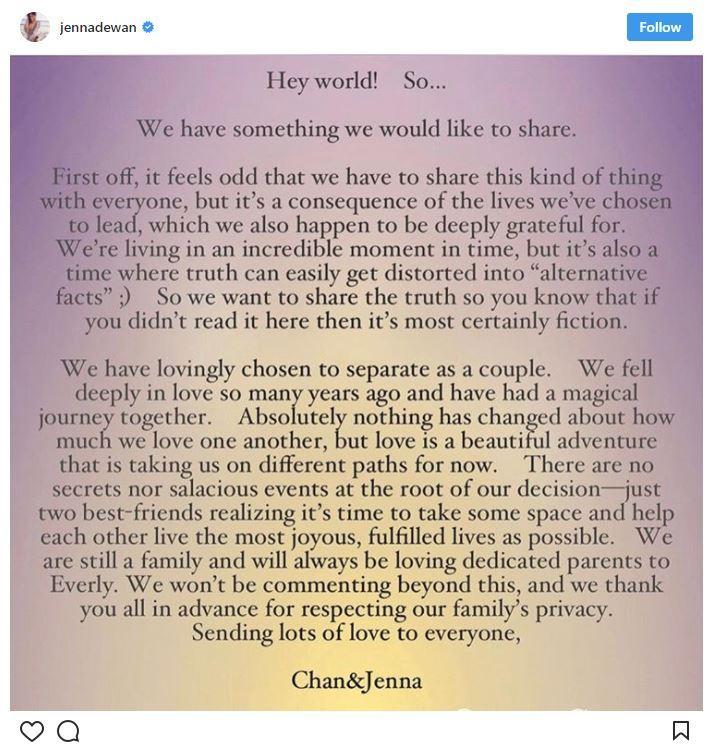 Το ζευγάρι, το οποίο έχει αποκτήσει μια κόρη, ανακοίνωσε το διαζύγιό του σε κοινή ανάρτηση στο Instagram:
