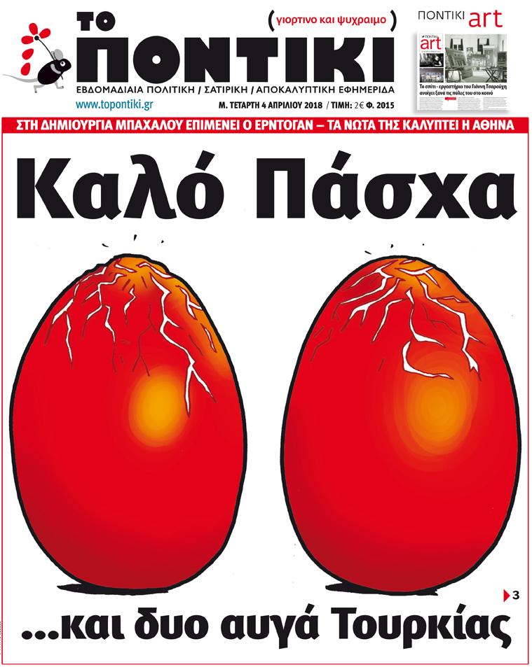 Με πρωτοσέλιδο τίτλο «Καλό Πάσχα… και δύο αυγά Τουρκίας» και αναλυτικό-αποκαλυπτικό ρεπορτάζ για τη δημιουργία μπάχαλου στην οποία επιμένει ο Τούρκος πρόεδρος Ερντογάν και τις κινήσεις της Αθήνας.