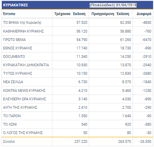 Κατά πολύ μειωμένες ήταν οι κυκλοφορίες των κυριακάτικων φύλλων την πρώτη Κυριακή του Απριλίου. Οι εφημερίδες πούλησαν συνολικά σε όλη την Ελλάδα 237.220 φύλλα (26.350 λιγότερα σε σύγκριση με την προηγούμενη Κυριακή).