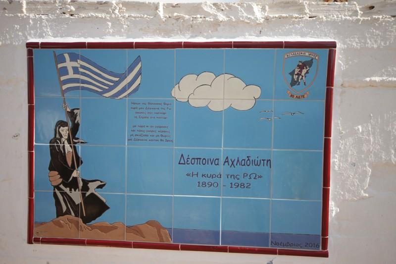 Εκεί βρίσκεται το μνημείο της Δέσποινας Αχλαδιώτη. Η ξακουστή Κυρά της Ρω, μοναδική κάτοικος του νησιού για πολλά χρόνια ύψωνε κάθε μέρα για δεκαετίες την Ελληνική σημαία, μέχρι το 1982 οπότε και απεβίωσε. Αντίγραφο του μνημείου βρίσκεται στη Μεγίστη. Η νησίδα Ρω διαθέτει δύο παραλίες, τον Άγιο Γεώργιο και τη Στρογγύλη.