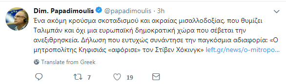 Σε σχετική ανάρτησή του στο Twitter αναφέρει: «Ένα ακόμη κρούσμα σκοταδισμού και ακραίας μισαλλοδοξίας, που θυμίζει Ταλιμπάν και όχι μια ευρωπαϊκή δημοκρατική χώρα που σέβεται την ανεξιθρησκεία. Δήλωση που ευτυχώς συνάντησε την παγκόσμια αδιαφορία: Ο μητροπολίτης Κηφισιάς “αφόρισε” τον Στίβεν Χόκινγκ».