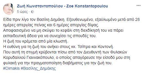 Τον Βασίλη Δημάκη επισκέφθηκε η πρώην πρόεδρος της Βουλής, Ζωή Κωνσταντοπούλου, που ανέφερε ότι ο φοιτητής είναι πλέον “εξαϋλωμένος”.