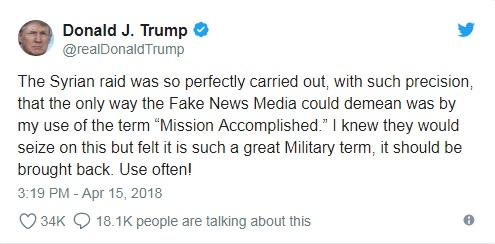 «Η επιδρομή κατά της Συρίας πραγματοποιήθηκε τόσο τέλεια, με τέτοια ακρίβεια, ώστε τα ΜΜΕ των Κατασκευασμένων Ειδήσεων θα μπορούσαν να την μειώσουν μόνο μέσω της χρήσης του όρου “Αποστολή Εξετελέσθη” από εμένα. Γνώριζα ότι θα εστίαζαν σε αυτό, αλλά το αισθάνθηκα ως έναν Στρατιωτικό όρο με πραγματικό μεγαλείο, για να το αποσύρω. Θα το χρησιμοποιώ συχνά!»