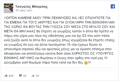 Σε ανάρτησή του στο Facebook λέει στον υπουργό Άμυνας: «να βουτάς τη γλώσσα σου μέσα στο μυαλό σου και μετά θα μιλάς».