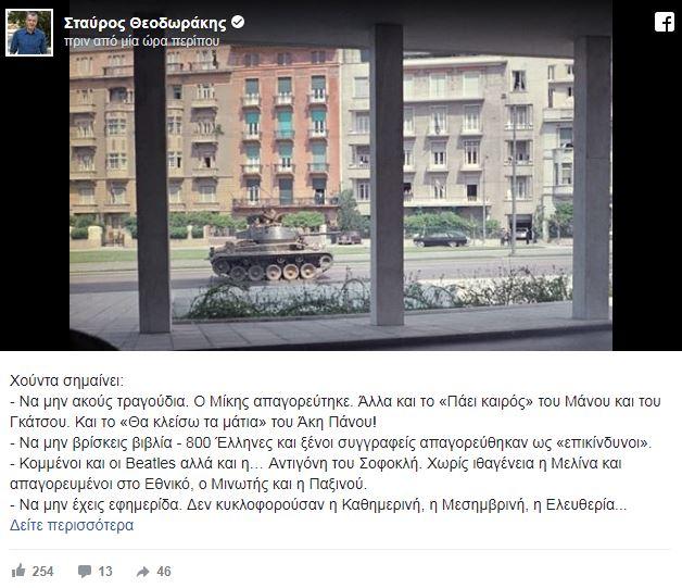 Με μία ανάρτηση στο Facebook ο Σταύρος Θεοδωράκης σχολιάζει τι σημαίνει χούντα.