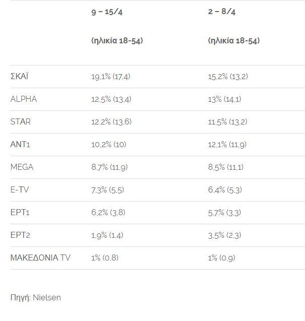 Μετά το Πάσχα η μέση τηλεθέαση, σύμφωνα με τη Nielsen, επανήλθε στα συνήθη ποσοστά, με τον ΣΚΑΪ να κερδίζει εκ νέου τους τηλεθεατές, αυξάνοντας το μερίδιό του κατά τέσσερις μονάδες, όσες είχε χάσει την εβδομάδα του Πάσχα.