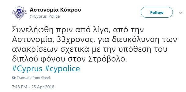 Συγκεκριμένα, όπως ανήρτησε στον λογαριασμό της στο Twitter η κυπριακή αστυνομία, «συνελήφθη πριν από λίγο, από την Αστυνομία, 33χρονος, για διευκόλυνση των ανακρίσεων σχετικά με την υπόθεση του διπλού φόνου στον Στρόβολο. #Cyprus #cypolice».