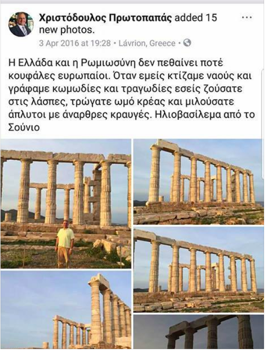 Η ΝΔ σχετικά με το νέο διευθυντή του Ελληνικού Διαστημικού Οργανισμού Χριστόδουλο Πρωτοπαππά υπενθυμίζει ανάρτησή του στο διαδίκτυο στις 3 Απριλίου του 2016 με φωτογραφίες του στο Σούνιο και την εξής λεζάντα: «Η Ελλάδα και η Ρωμιωσύνη δεν πεθαίνει ποτέ κουφάλες Ευρωπαίοι. Όταν εμείς κτίζαμε ναούς και γράφαμε κωμωδίες και τραγωδίες εσείς ζούσατε στις λάσπες, τρώγατε ωμό κρέας και μιλούσατε άπλυτοι με άναρθρες κραυγές. Ηλιοβασίλεμα από το Σούνιο».