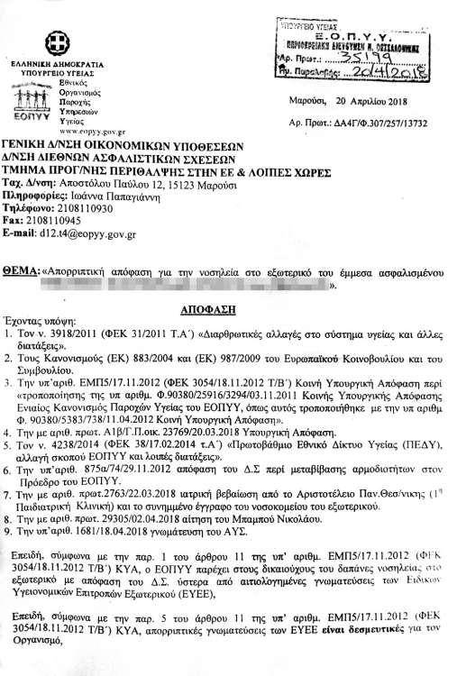 Επιπλέον, η 32χρονη μητέρα έπρεπε να στείλει εξώδικο ώστε να πάρει την απορριπτική απόφαση του ΕΟΠΥΥ, γιατί το Συμβούλιο δεν την έδινε! Η απόρριψη του αιτήματος γκρέμισε τις όποιες ελπίδες της μητέρας. Το αγγλικό νοσοκομείο είχε κάνει ήδη δεκτό το παιδί της και τους περίμενε τη Δευτέρα 23 Απριλίου.