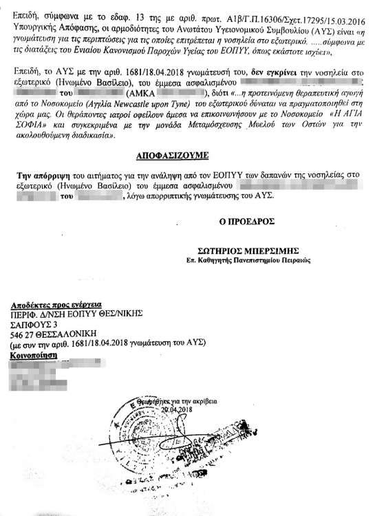 Ομως, αυτό δεν εμπόδισε τον ΕΟΠΥΥ να απορρίψει την αίτηση δίχρονου (!) για μετάβαση σε δημόσιο νοσοκομείο της Αγγλίας για θεραπεία!