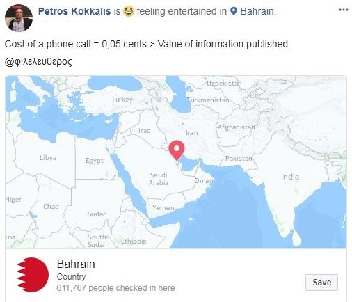 Συγκεκριμένα, ο πρώην αντιπρόεδρος του Ολυμπιακού απάντησε μέσω Facebook, κάνοντας chek-in από το Μπαχρέιν όπου βρίσκεται: «Cost of a phone call = 0,05 cents > Value of information published @φιλελευθερος», δηλαδή, «κόστος ενός τηλεφωνήματος=0,05 σεντς μεγαλύτερη από την αξία της πληροφορίας που δημοσιεύεται».