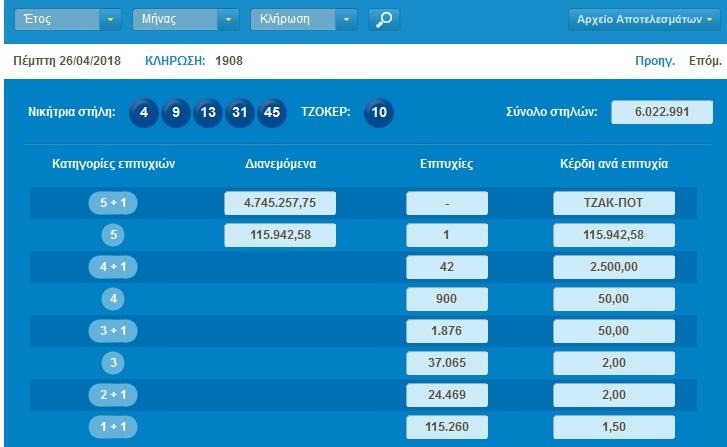 H κλήρωση Τζόκερ ΟΠΑΠ, χθες Πέμπτη 26-04-2018 (αριθμός κλήρωσης 1908), μοίραζε περισσότερα από 4.700.000 ευρώ στους νικητές της πρώτης κατηγορίας. Οι τυχεροί αριθμοί στην κλήρωση Τζόκερ (1908) είναι οι εξής: 4, 9, 13, 31, 45 και Τζόκερ ο αριθμός 10. Οι νικητές της πρώτης κατηγορίας στην επόμενη κλήρωση της ερχόμενης Κυριακής θα μοιραστούν τουλάχιστον 5.500.00 ευρώ.