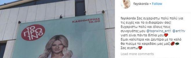 «Σας ευχαριστώ πολύ για τις ευχές και το ενδιαφέρον σας! Ευχαριστώ πολύ και όλους τους συνεργάτες μου @toprwino_ant1 @ant1tv γιατί είναι πάντα δίπλα μου Είμαι καλύτερα και Δευτέρα με το καλό θα πιούμε το καφεδάκι μας μαζί. Σας αγαπώ» έγραψε στον προσωπικό της λογαριασμό στο instagram.
