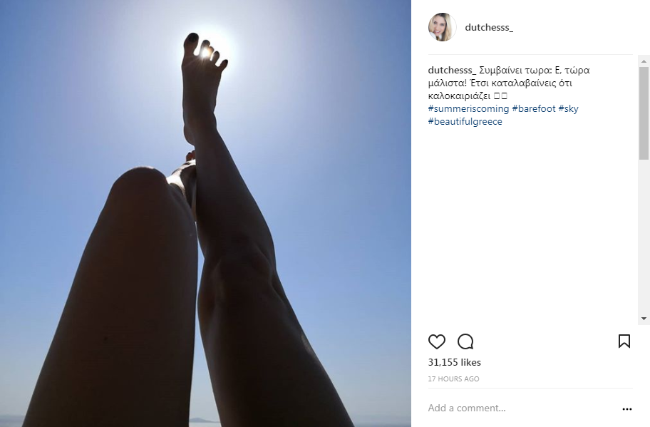 Η ίδια, μάλιστα, δημοσίευσε στον προσωπικό της λογαριασμό στο Instagram μια φωτογραφία των καλλίγραμμων ποδιών της από την ώρα που έκανε ηλιοθεραπεία, σχολιάζοντας: “Συμβαίνει τωρα: Ε, τώρα μάλιστα! Έτσι καταλαβαίνεις ότι καλοκαιριάζει”.
