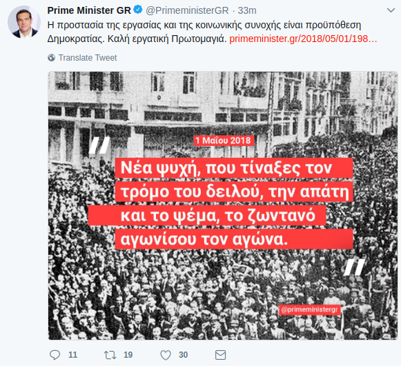 Η ανάρτηση του πρωθυπουργού συνοδεύεται από παλιά φωτογραφία συγκεντρωμένου πλήθους για την Εργατική Πρωτομαγιά, όπου αναγράφονται οι στίχοι του ποιητή Ρήγα Γκόλφη: «Ω νέα ψυχή, που τίναξες τον τρόμο του δειλού, την απάτη και το ψέμα, το ζωντανό αγωνίσου τον αγώνα».