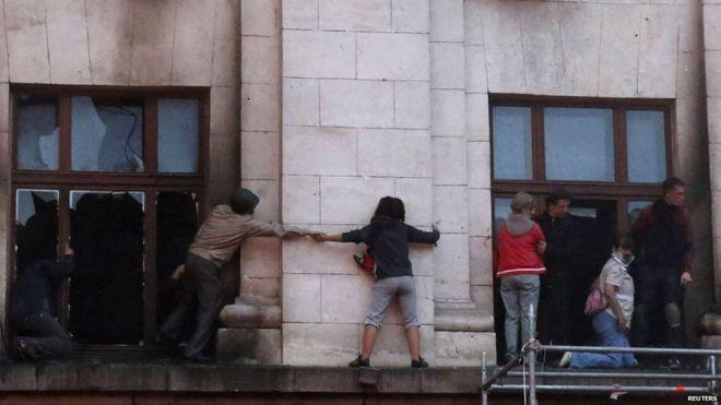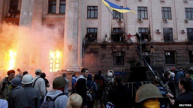 Οι προκλήσεις των ακροδεξιών σύντομα μετατράπηκαν σε επιθέσεις και δεκάδες διαδηλωτές, για να σωθούν, κατέφυγαν στο Μέγαρο των Συνδικάτων της Οδησσού. «Αφηνιασμένοι» όμως οι ακροδεξιοί δεν δίστασαν ούτε λεπτό να βάλουν φωτιά στο κτήριο, καίγοντας ζωντανούς όσους, άντρες και γυναίκες, βρίσκονταν στο κτήριο. Όσοι προσπάθησαν να σωθούν πηδώντας από τα παράθυρα πυροβολούνταν από τους νεοναζί που βρίσκονταν περιμετρικά του φλεγόμενου κτηρίου. Καθ’ όλη τη διάρκεια του επεισοδίου η αστυνομία ήταν απούσα – εμφανίστηκε μόνο όταν ήταν πια πολύ αργά καθώς τα σύγχρονα ουκρανικά τάγματα εφόδου είχαν ολοκληρώσει το αποτρόπαιο έργο τους.