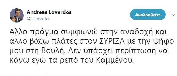 Στις φωνές των διαφωνούντων προστέθηκε και ο Ανδρέας Λοβέρδος, ο οποίος με ένα αιχμηρό tweet δήλωσε ότι «άλλο πράγμα συμφωνώ στην αναδοχή και άλλο βάζω πλάτες στον ΣΥΡΙΖΑ με την ψήφο μου στη Βουλή. Δεν υπάρχει περίπτωση να κάνω εγώ τα ρεπό του Καμμένου».