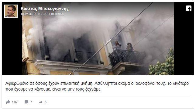 Σε όσους έχουν επιλεκτική μνήμη αφιερώνει ο Κώστας Μπακογιάννης ανάρτησή του το στο Facebook με αφορμή τη συμπλήρωση 8 χρόνων από την τραγωδία της Marfin.