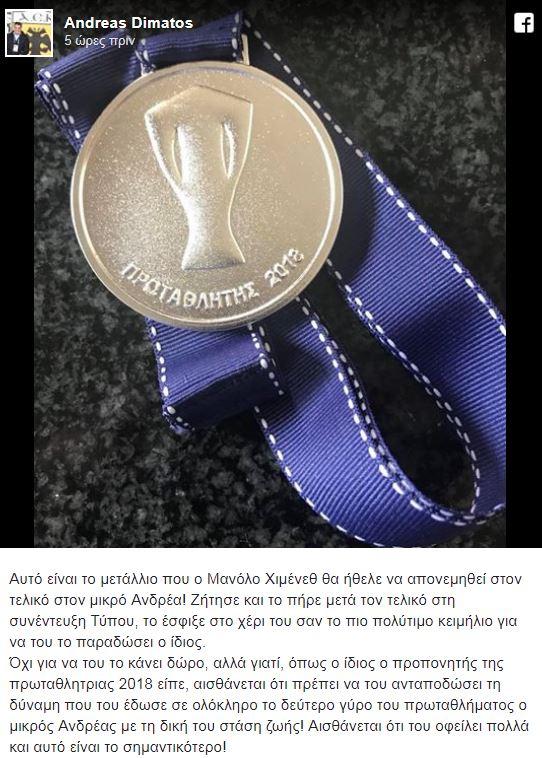 Την αποκάλυψη πως μετά την χθεσινή απονομή τίτλου στη Ριζούπολη, ο Μανόλο Χιμένεθ ζήτησε ένα μετάλλιο πρωταθλητή προκειμένου να το δωρίσει στον φίλο της ΑΕΚ, Ανδρέα ο οποίος δίνει το δικό του αγώνα έκανε ο Ανδρέας Δημάτος.