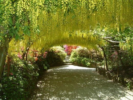 Όταν ανθίζουν τα λαβούρνα γέρνουν τα κλαδιά τους δικαιώνονται αυτοί που βάφτισαν αυτή τη θέα «χρυσή βροχή». Κσι όταν τα πέταλα πέφτουν εδώ και εκεί στο έδαφος το πέρασμα σ’ αυτό το τούνελ μοιάζει σαν είσοδος στον κόσμο των παραμυθιών.