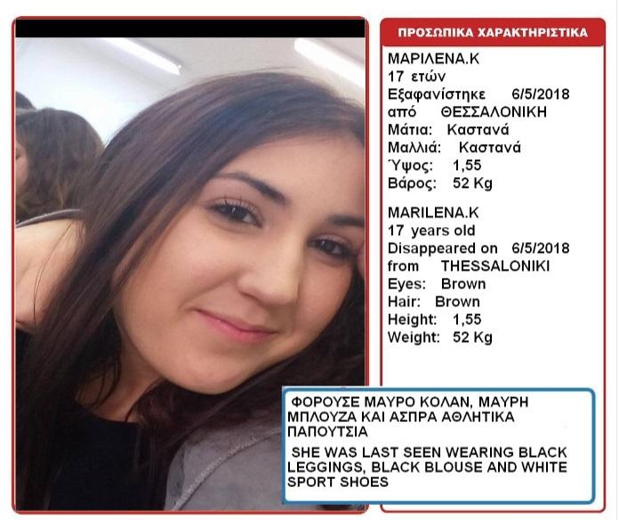 Στις 6 Μαΐου χάθηκαν τα ίχνη της 17χρονης Μαριλένας Κ. από την περιοχή της Πυλαίας Θεσσαλονίκης.