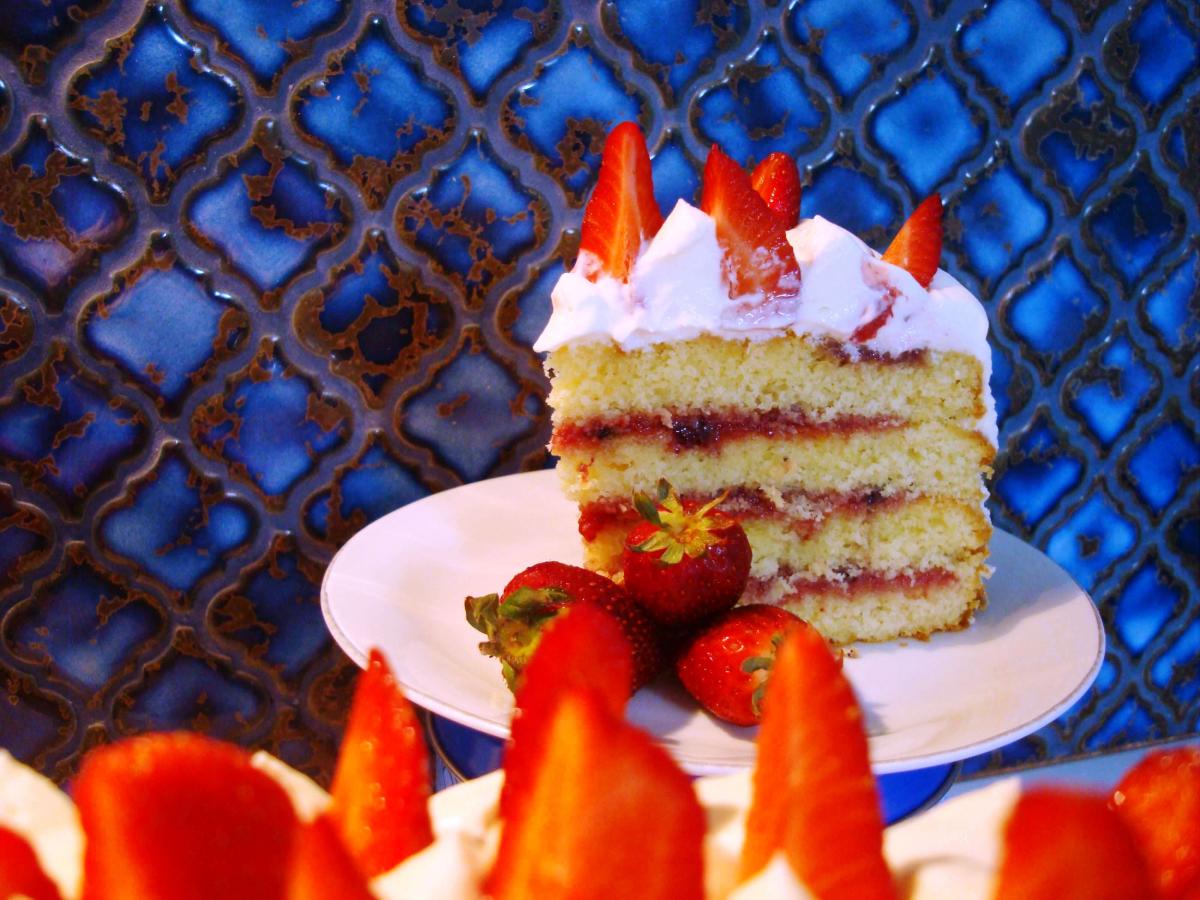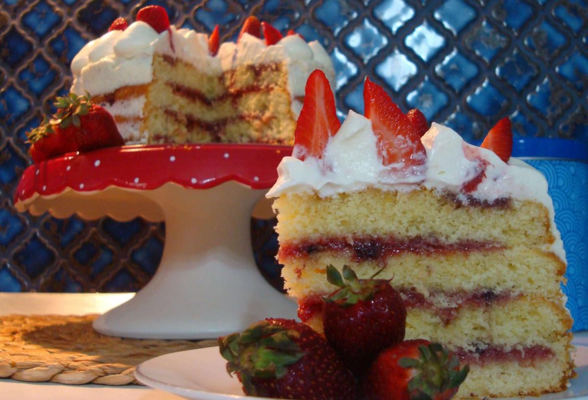Με κοφτερό μαχαίρι χωρίζουμε κάθε παντεσπάνι σε δυο φέτες. Μοντάρουμε την τούρτα σε τουρτιέρα. Κάνουμε στρώσεις παντεσπάνι και μαρμελάδα εναλλάξ. Αφήνουμε στο ψυγείο για να ποτίσει καλά η μαρμελάδα το γλυκό.