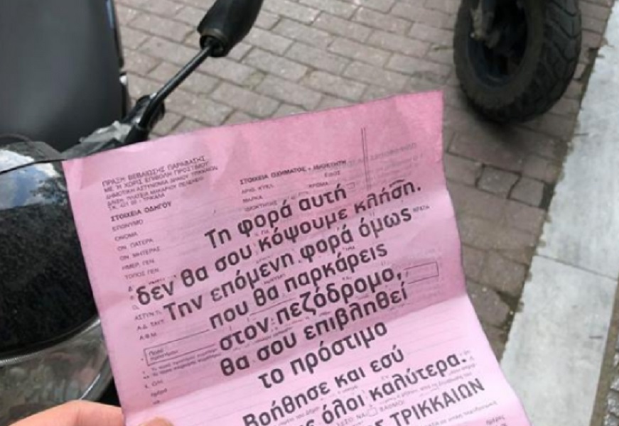 «Τη φορά αυτή δεν θα σου κόψουμε κλήση. Την επόμενη φορά όμως που θα παρκάρεις στον πεζόδρομο θα σου επιβληθεί το πρόστιμο. Βοήθησε και εσύ να ζήσουμε όλοι καλύτερα. ΔΗΜΟΣ ΤΡΙΚΚΑΙΩΝ».